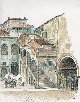Dora Noyes (Harrow, Middlesex, 1864 - Sutton Veny, Wiltshire 1960), Scalone del palazzo degli Este (ora Municipale), 1904; china e acquerello su cartoncino, mm 361 x 277; Londra, collezione privata.
