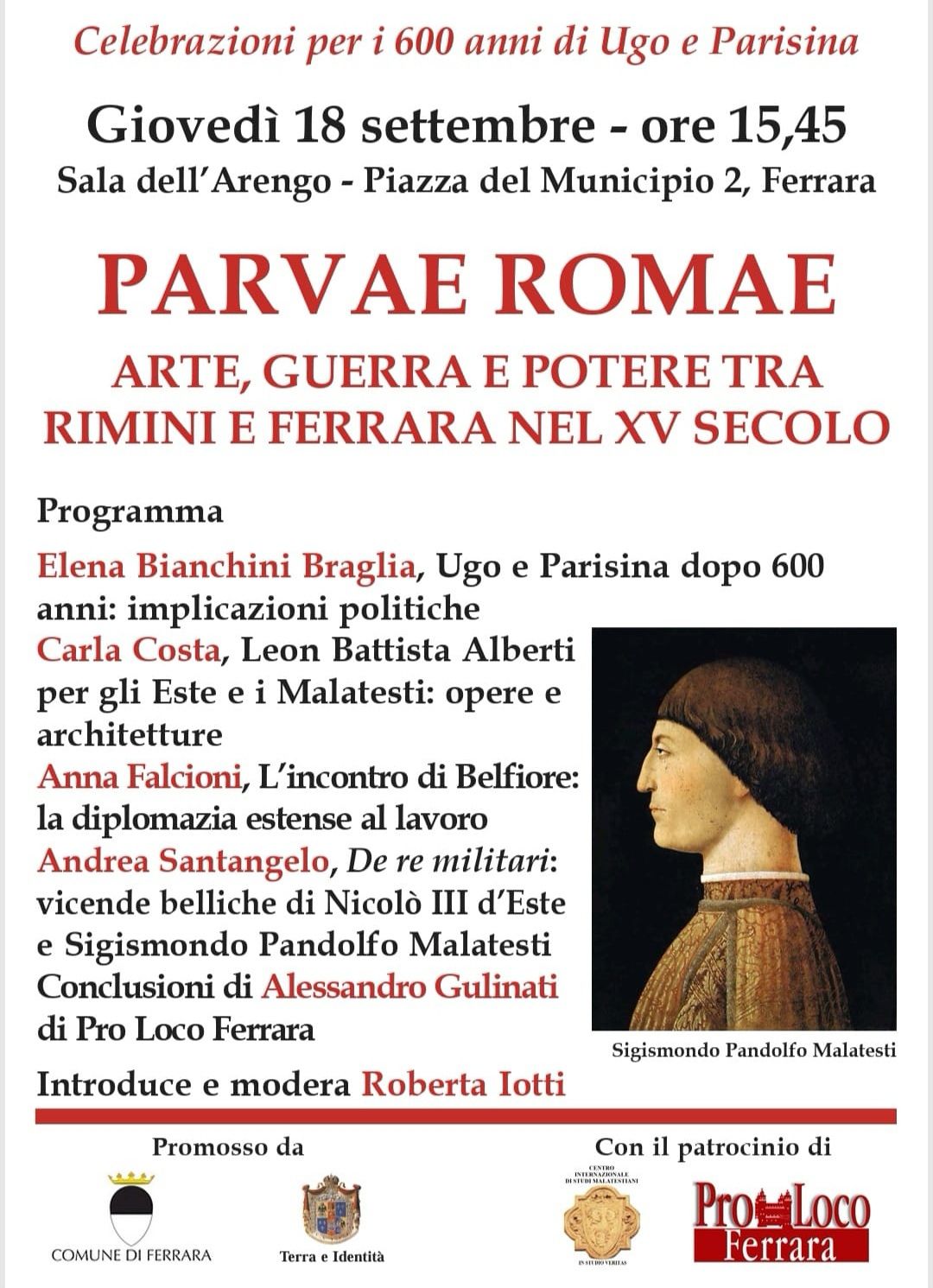Parvae Romae. Arte, guerra e potere tra Rimini e Ferrara nel XV secolo è il titolo del convegno che si terrà giovedì 18 settembre alle ore 15,45 presso la sala dell'Arengo nel palazzo comunale di Ferrara. L'evento rientra nel programma delle celebrazioni per il 600° della decapitazione di Ugo e Parisina promosse dal Comune di Ferrara e dall'associazione Terra e Identità che da 25 anni si occupa di studiare e valorizzare la storia estense.