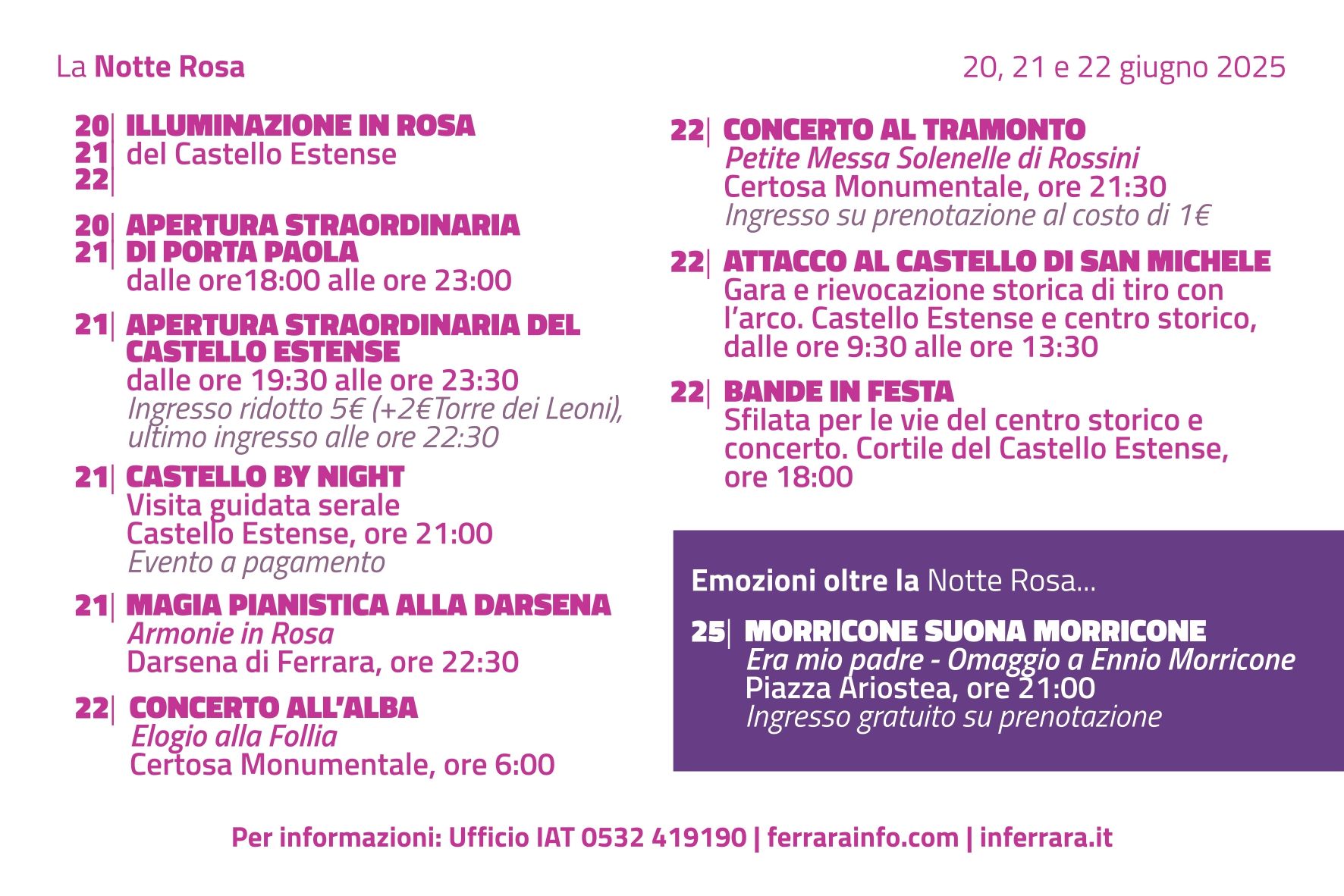 Ferrara celebra la musica e la bellezza per la Notte Rosa 2025. Lo farà con una serie di iniziative culturali e di spettacolo per tutta la città e per i turisti. Il Comune di Ferrara, insieme a Ferrara Tua e al Teatro Comunale di Ferrara, aderisce anche quest’anno al progetto “La Notte Rosa”, che in tutta la regione prevede l’organizzazione di eventi musicali, teatrali e di valorizzazione del patrimonio monumentale nelle tre giornate del 20, 21 e 22 giugno 2025.