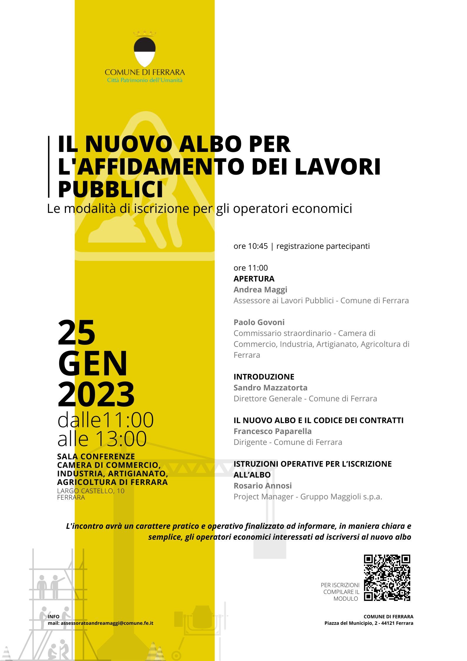 Il nuovo albo per l'affidamento dei lavori pubblici del Comune di Ferrara e le modalità di iscrizione per gli operatori economici saranno al centro di un incontro informativo in programma mercoledì 25 gennaio 2023 alle 11 nella sede della Camera di Commercio di Ferrara (largo Castello 10).